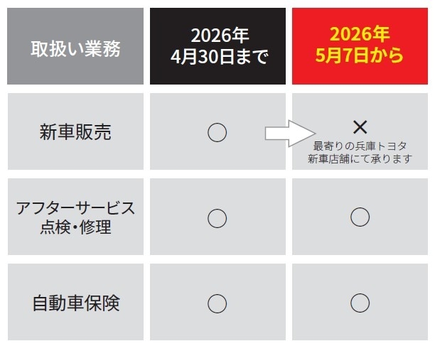 2026 年4月末日をもちまして三宮東店の店舗機能を変更し「特販営業所 三宮メンテナンスセンター」としてリニューアルさせていただく事となりました 。
