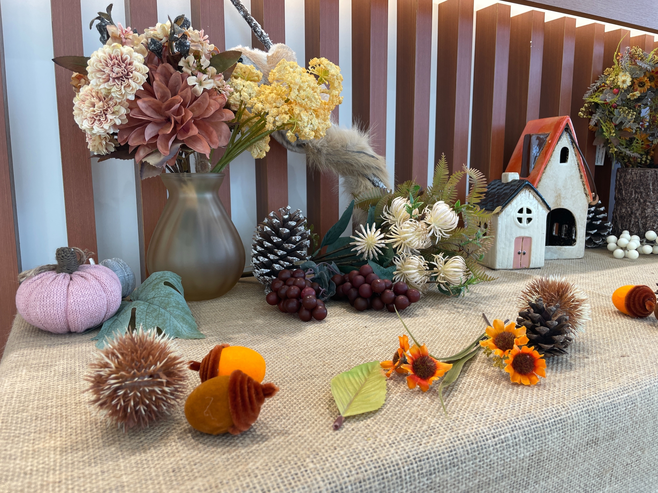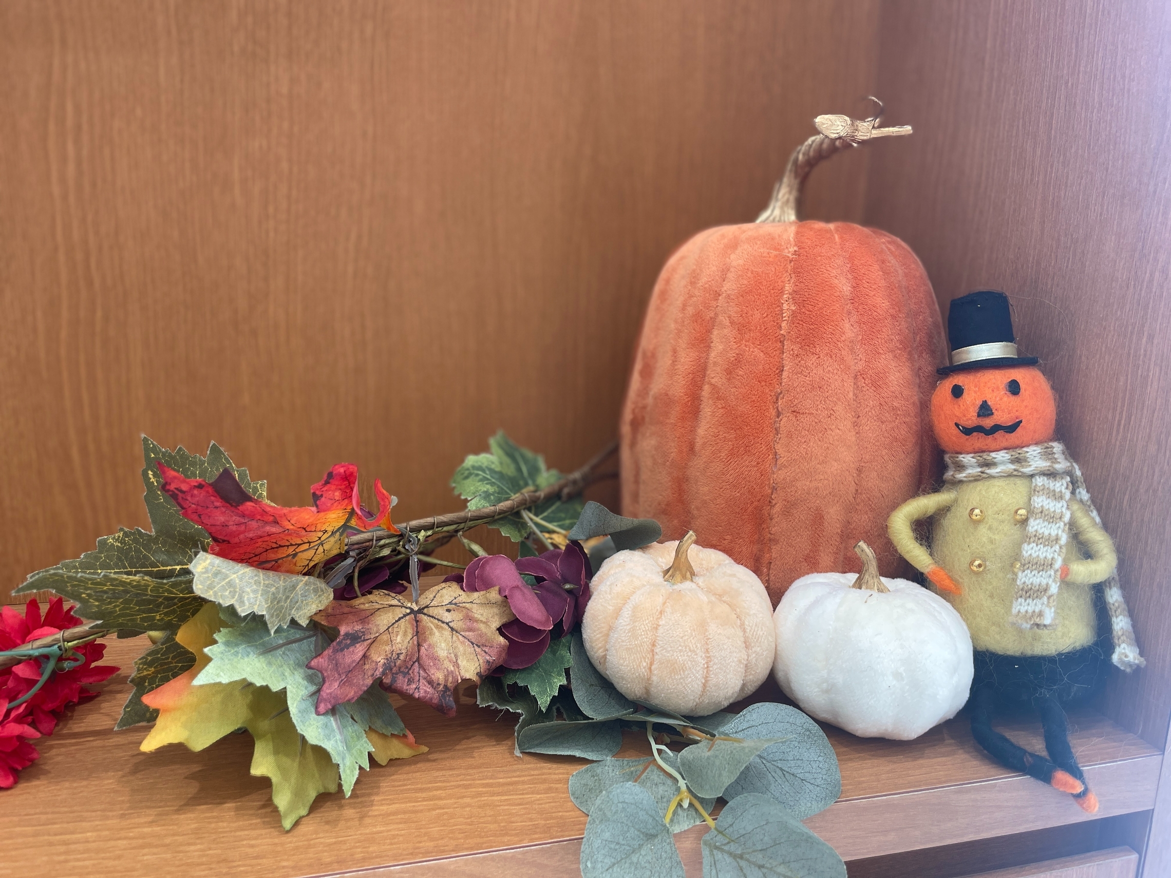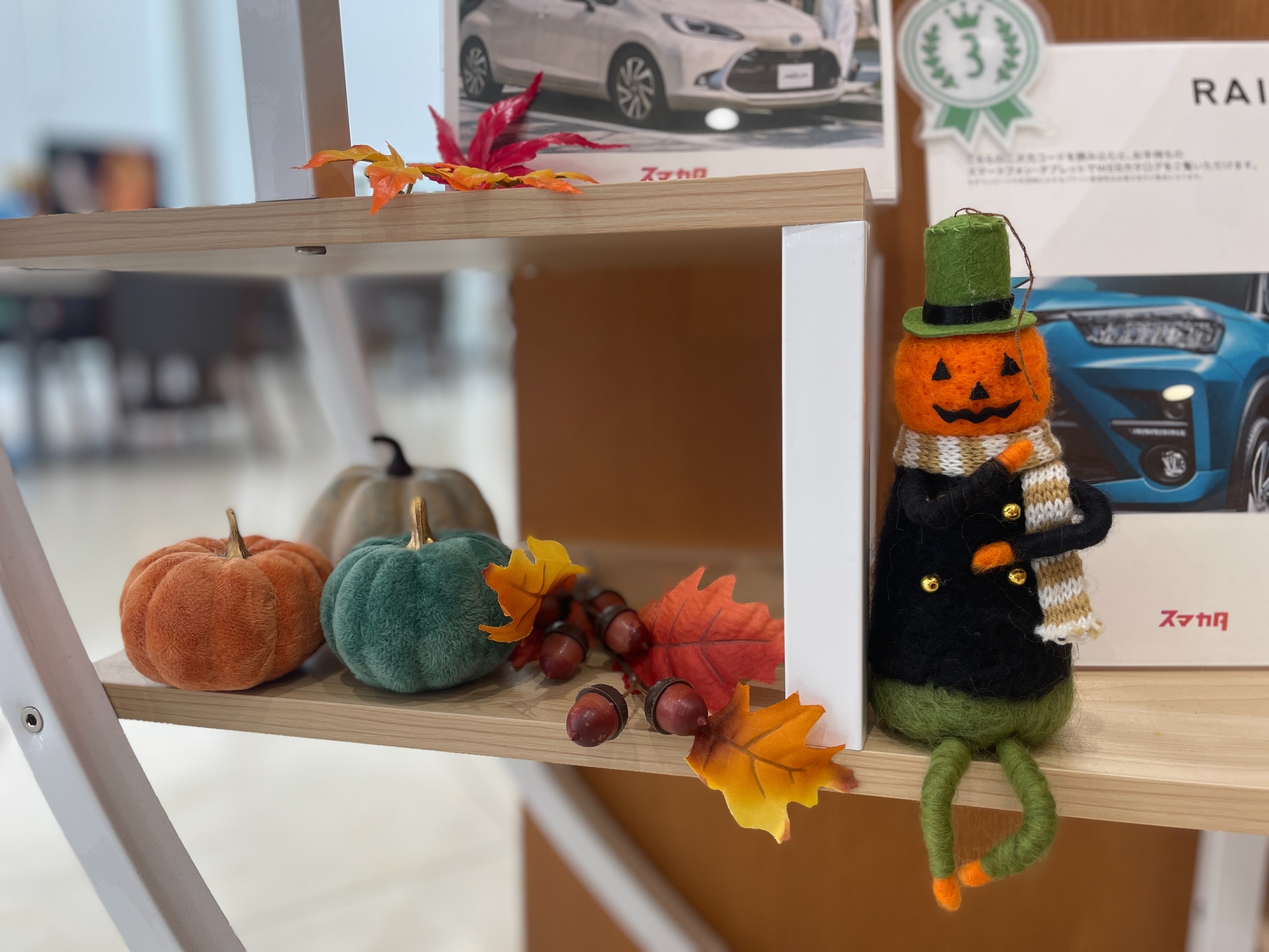 ショールーム入り口やテレビ前など秋の仕様になっておりますので