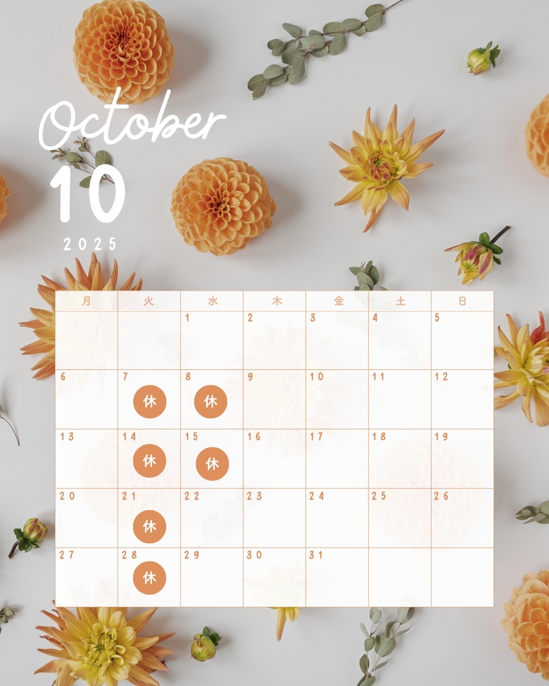 9月も残すところ一週間!10月の定休日のおしらせです💛✨