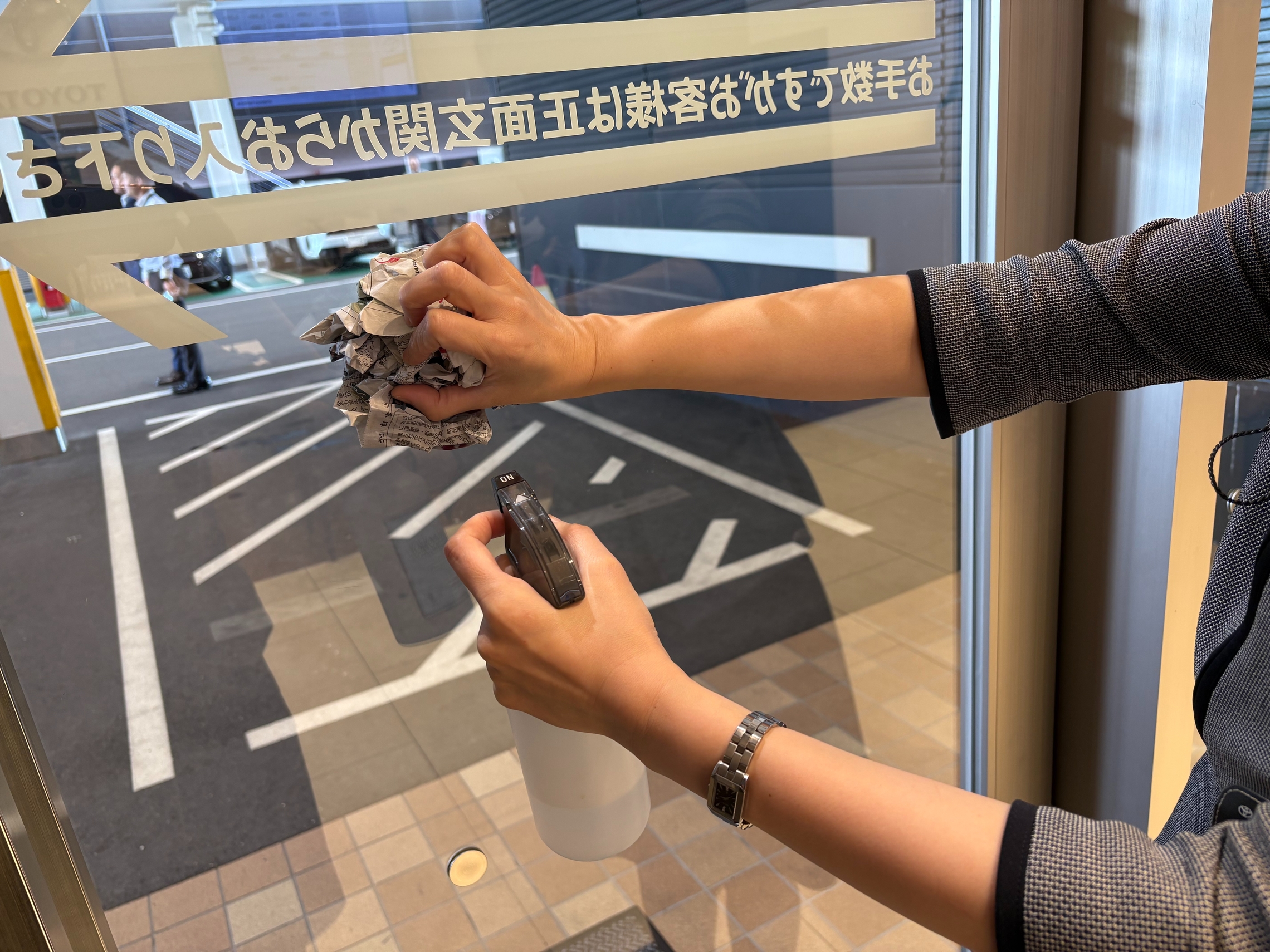 スプレーボトルに水を入れて、丸めた新聞紙で窓ガラスを拭き拭き✨