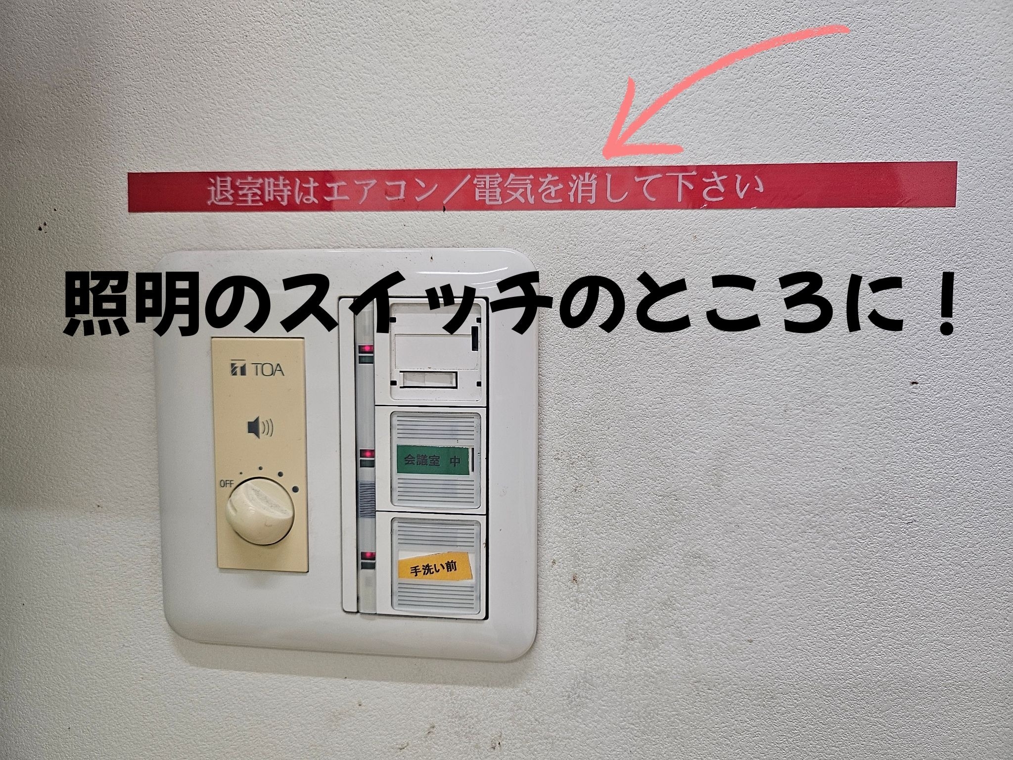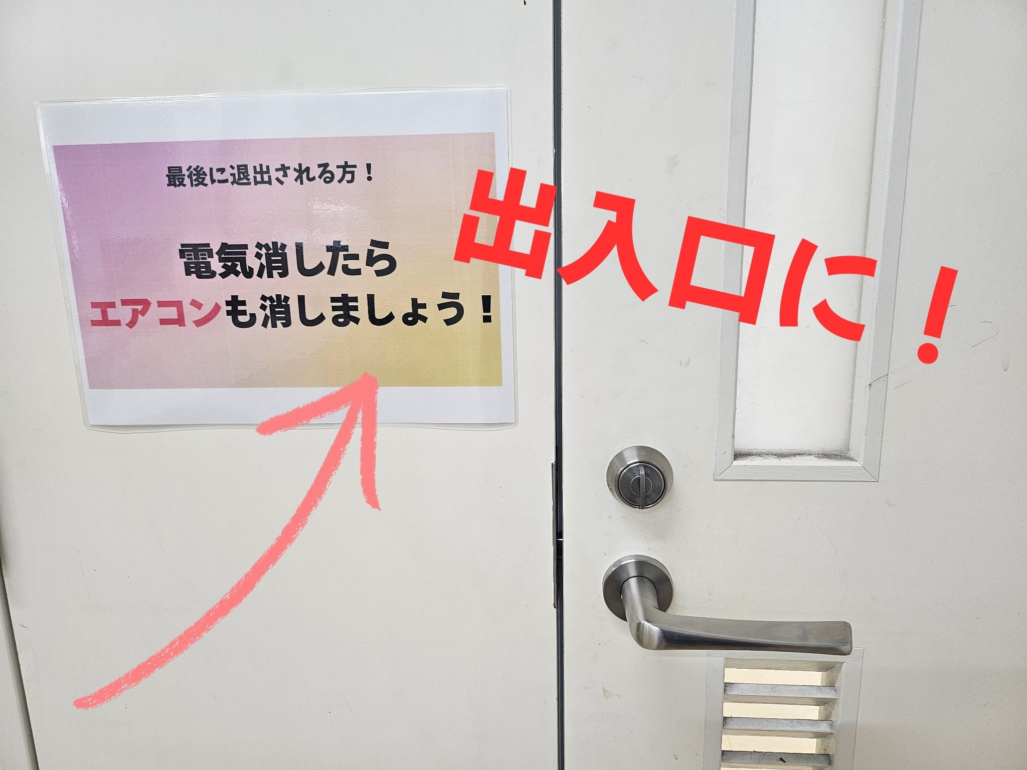 また、電気は消してもエアコンはつけっぱなしだった!とならないように出入口付近に張り紙を・・・