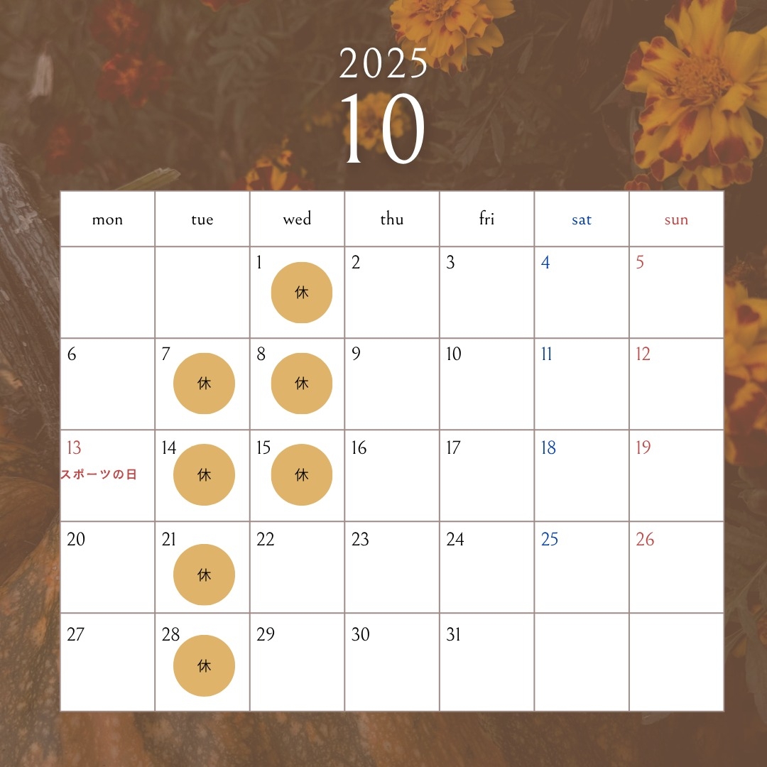 本日は10月、定休日のご案内です。