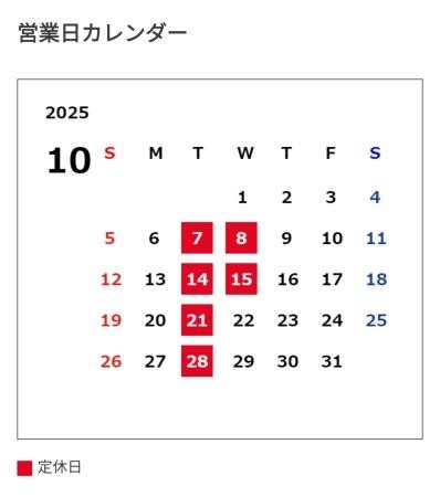 10月は⑦⑧⑭⑮㉑㉘が定休日となっております。