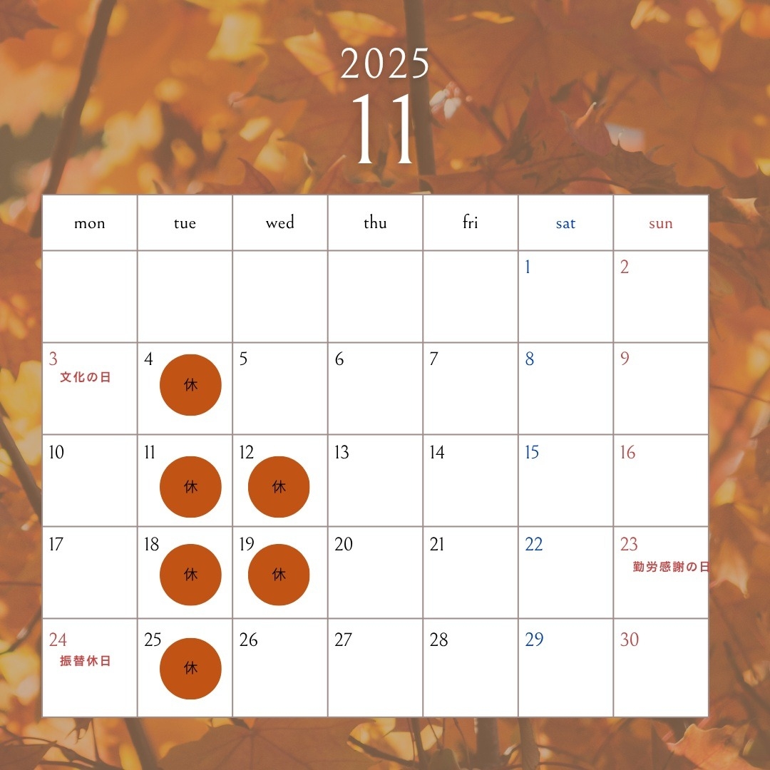 11月定休日のご案内 2025.11.05 皆さまこんにちは。明石店です。 11月の営業カレンダーをご案内します🌰🍄 今月はクリスマスの装飾を予定しています🎄🎁 またブログで紹介しますね! では、たくさんのご来店お待ちしております😊 前の記事へ 店舗ブログ一覧に戻る 次の記事へ