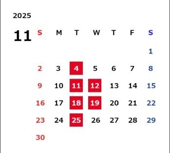 11月は⑦⑧⑭⑮㉑㉘(毎週火曜日と第二・第三水曜日)となります。