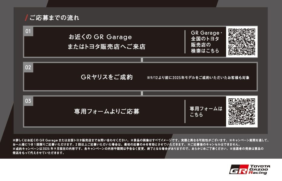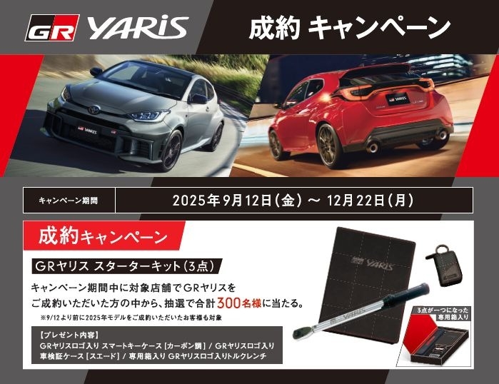 GRヤリス成約キャンペーン✨ 2025.10.25 こんにちは😊 本日の宝塚はあいにくの雨☔ 気温も低く、裏起毛のトレーナーで出勤しました。。 地元が晴れていたので傘を持って出なかったのに宝塚につくと傘がいるレベルの雨… お店まで走って出勤しました…朝から災難でしたが、本日も頑張ります🔥 さて、本日はGRヤリスの成約キャンペーンのご案内です✨ GRヤリスの詳細はこちら👈から 期間中、GRヤリスをご成約いただいたお客様抽選で300名様にロゴ入りスターターキットをプレゼント致します! ご応募方法はこちら👇 ご不明な点や気になることがございましたらお気軽にお問い合わせください😊 皆様ご来店お待ちしております😊 前の記事へ 店舗ブログ一覧に戻る 次の記事へ