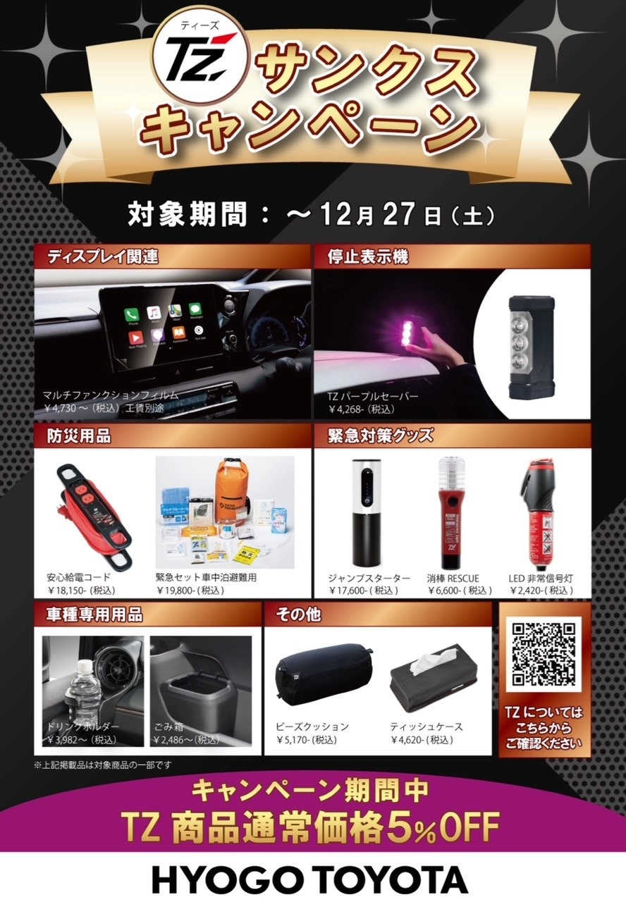 サンクスキャンペーン🌈 2025.11.09 こんにちは、姫路店です😊 兵庫トヨタでは12月27日(土)まで 【TZ】サンクスキャンペーンを開催中⭐ TZとは、トヨタモビリティパーツオリジナルブランドで 全国展開開始より5周年を記念してキャンペーンを実施いたします🚙💗 他にも!! お車で快適に過ごしていただけるようなグッズがたくさんあるので 詳しくはスタッフまでお尋ねくださいませ😄✨ 皆様のご来店お待ちしております💕 前の記事へ 店舗ブログ一覧に戻る 次の記事へ