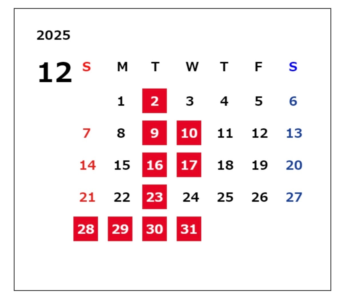 12月定休日のご案内🎄☃️ 2025.11.30 こんにちは!姫路西店です😊 今年もあと1ヶ月となりました! もう1年が終わってしまいますね… 寒くなってきたので体調にはお気をつけください(^^♪ あと1ヶ月走り切りましょーう!!🔥 本日は12月定休日と年末年始の休みのご案内です! 毎週火曜日と第2第3水曜日が定休日となっております🎅🏻💞 年末年始は12月28日から1月4日まで休みとなっております! ご不便をおかけし申し訳ございませんがよろしくお願いいたします。 ただいま2026年の兵庫トヨタカレンダーもお配りしているので ぜひお持ち帰りください💖 12月も皆様のご来店お待ちしております😊💜 前の記事へ 店舗ブログ一覧に戻る 次の記事へ