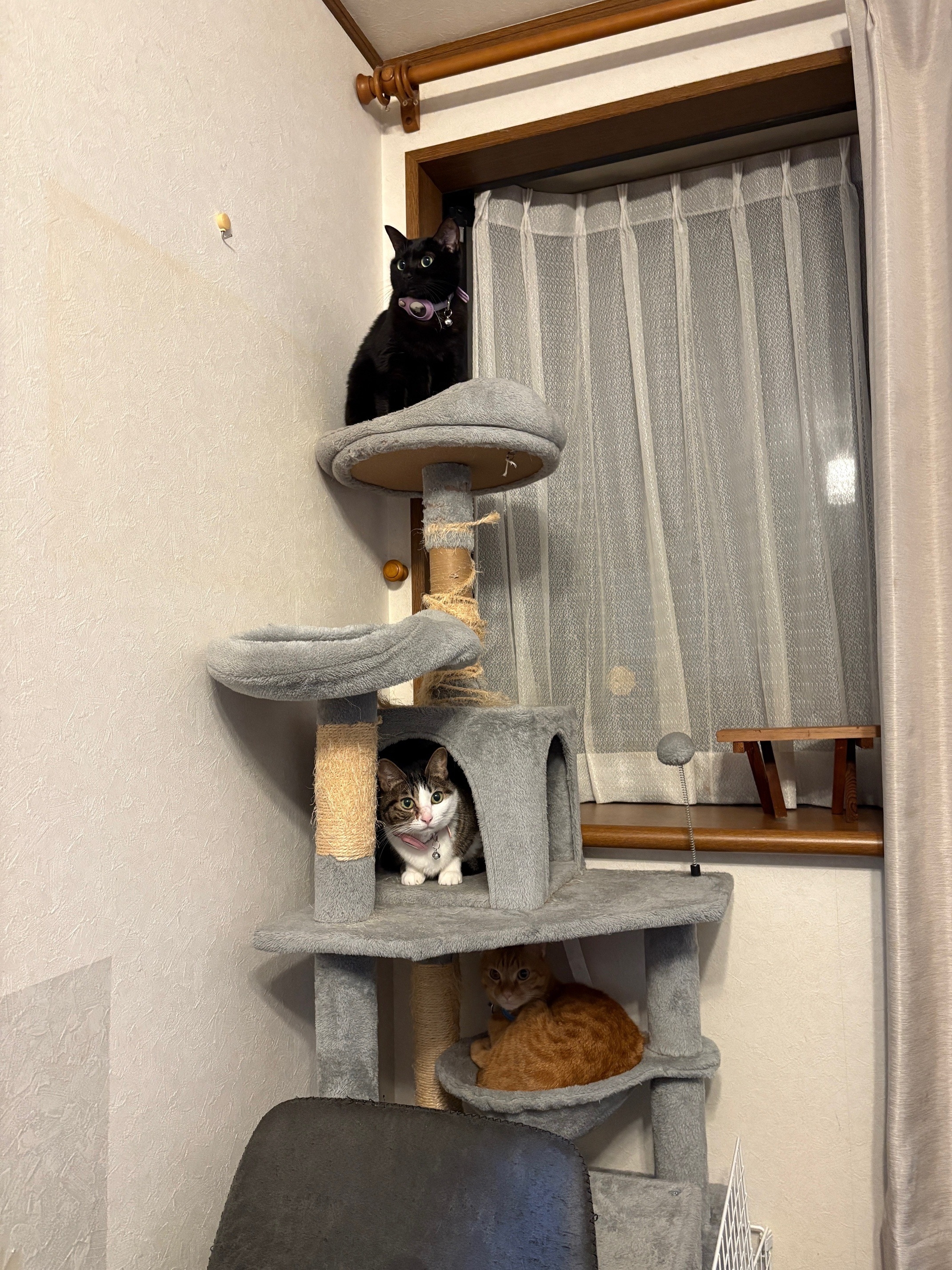 友達のにゃんず達が珍しくキャットタワーに3匹ともいて可愛すぎたので激写しました😻😻😻