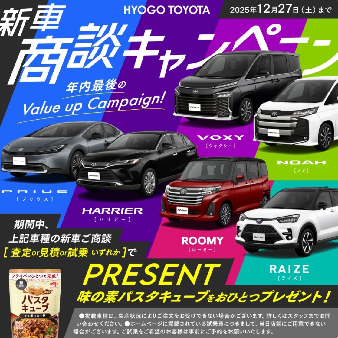 新車ご検討中のお客様💜 ~12/27まで! 2025.12.06 こんにちは🎵 兵庫トヨタ姫路西店です! 本日は皆様にお知らせです💛 12/6~12/27の期間 ✅VOXY ✅NOAH ✅PRIUS ✅HARRIER ✅ROOMY ✅RAIZE の対象車種をご商談 (査定or見積or試乗)いただいたお客様に 味の素パスタキューブをおひとつプレゼント!! ご来店時 LINEのクーポン画面をスタッフに ご提示ください🍀 年末は12/27㈯まで営業しております 皆様のご来店お待ちしております💖 前の記事へ 店舗ブログ一覧に戻る 次の記事へ