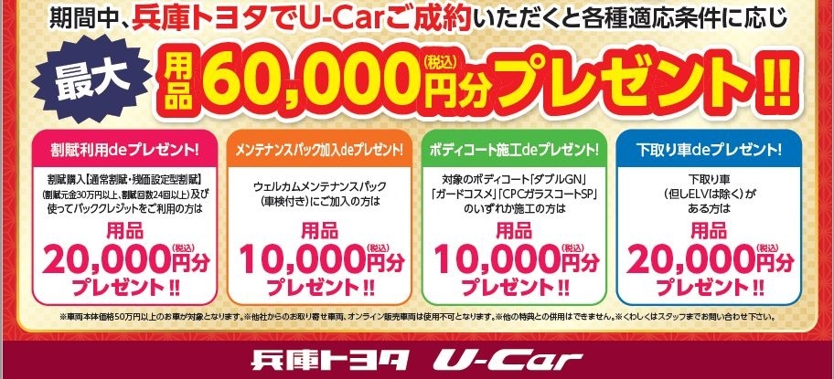 兵庫トヨタでU-CARご成約いただくと①割賦利用・②メンテナンスパック加入・③ボディーコート施工・④下取り車有り①~④各種条件適応に応じ最大用品60,000円分(税込)プレゼント!!