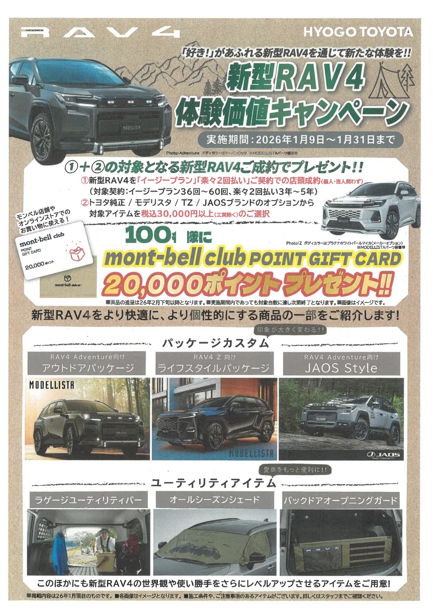 新型RAV4ご成約(条件あり)で先着100名様に「mont-bell club point GIFT CARD」を20000ポイント🎁プレゼントしております!😊