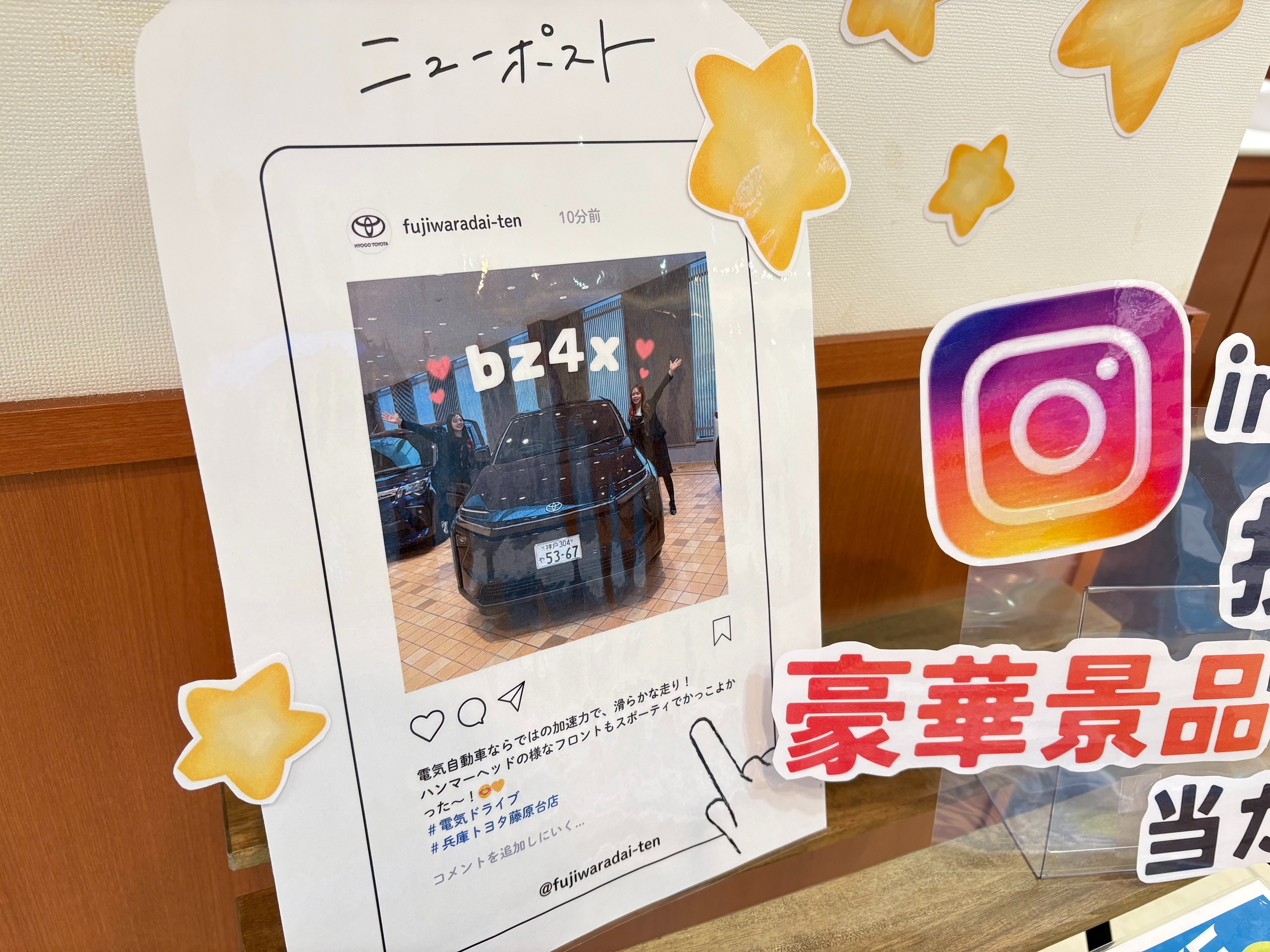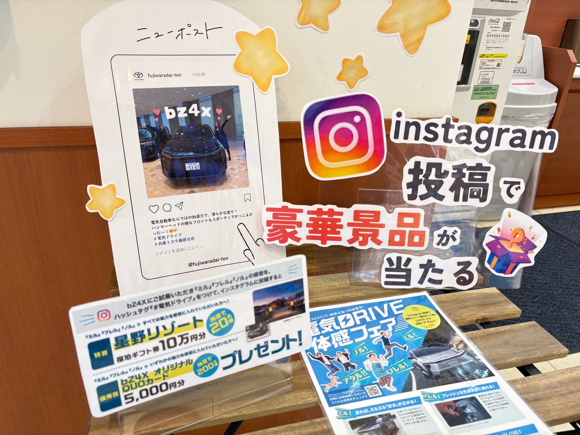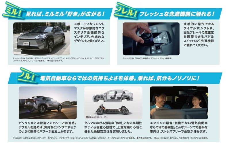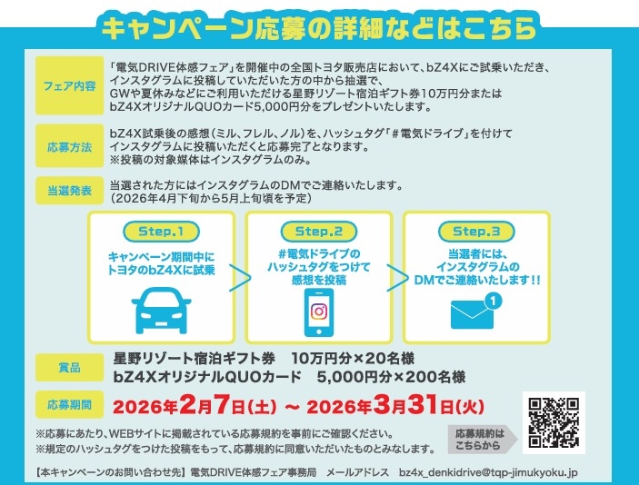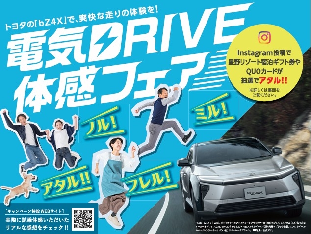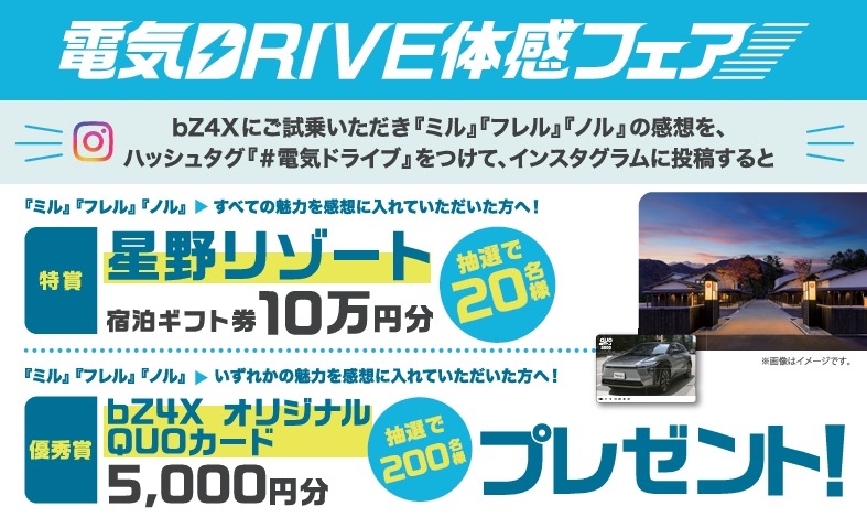 ☆bz4xにご試乗いただき「ミル」「フレル」「ノル」の感想をハッシュタグ「#電気ドライブ」をつけてインスタグラムに投稿して頂ければ豪華賞品が当たるキャンペーンに応募できます!🎁✨