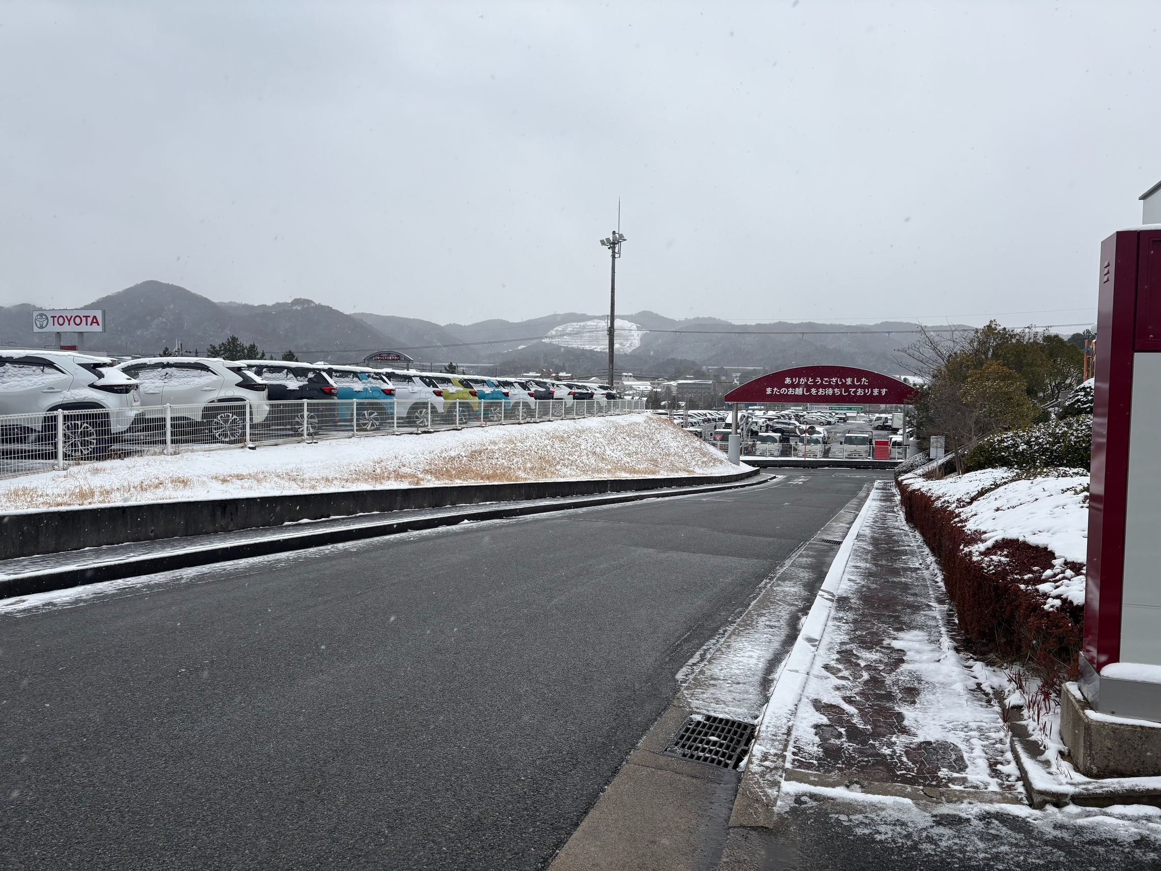 坂の下の入り口付近はとても積もっており、先ほど動けなくなった車もございました💦