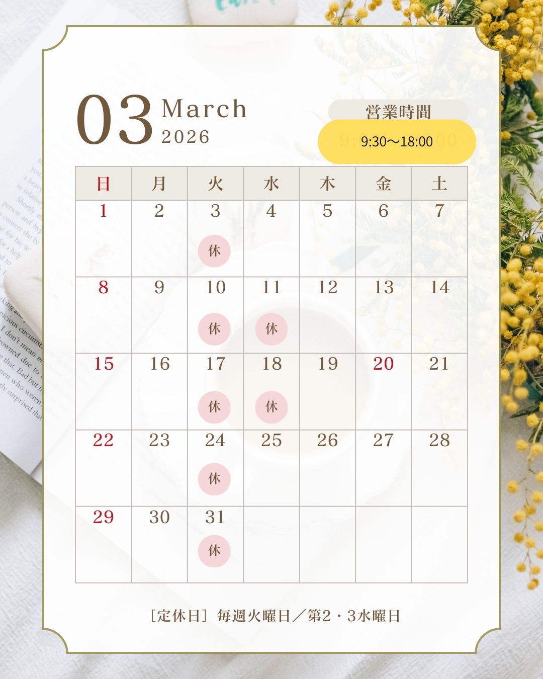 3月営業日のご案内 2026.02.25 こんにちは、明石店です 今年初のまとまった雨になりました☔☔☔ 恵みの雨で水不足が解消されそうです😊✨ 予報をみるとあまり天気が良くない日が多そうですね。 視界が悪くなりますし、道も悪くなります。 お出かけの際は足元・運転に十分ご注意ください⚠️ 3月の営業日カレンダーです 今年度最終月、スタック全員でがんばります! 前の記事へ 店舗ブログ一覧に戻る 次の記事へ