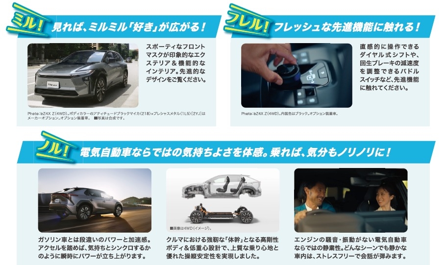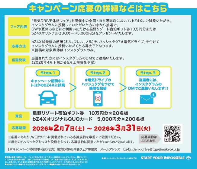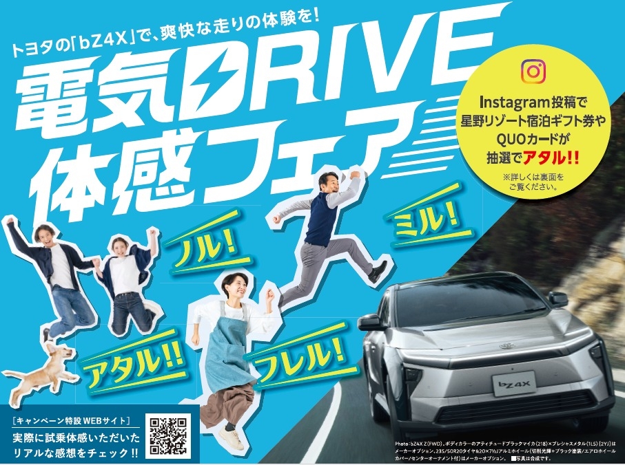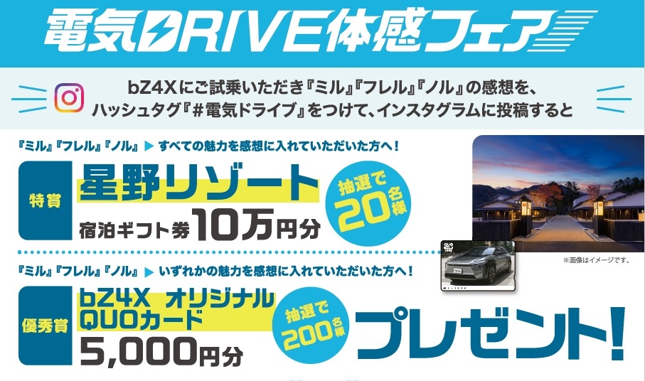 電気自動車の『bZ4X』をご試乗いただき「ミル、ノル、フレル」で体感していただいた感想をインスタグラムでハッシュタグ「#電気ドライブ」をつけて投稿していただくと『星野リゾート宿泊ギフト券』または『QUOカード5000円分』が抽選で総勢220名様に当たります😊😊😊