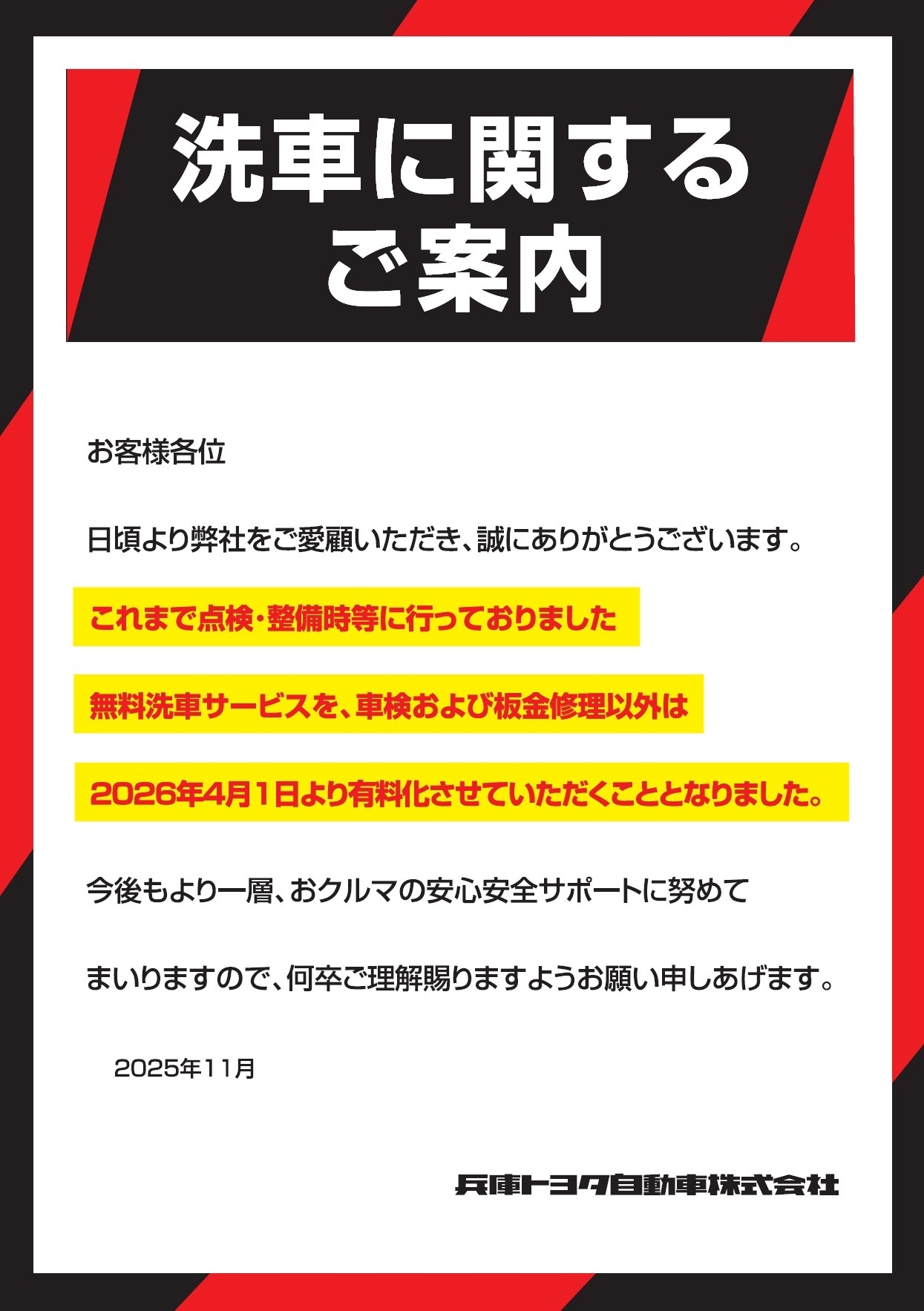洗車サービスに関するお知らせ 2026.02.16 いつも伊丹昆陽店のブログご覧いただきありがとうございます(*'ω'*) 本日は洗車サービスに関する大切なお知らせです💡 これまで点検でご入庫いただいた際に行っていた無料洗車サービスですが、 2026年4月1日より有料化させていただくこととなりました。 車検・板金でのご入庫は従来通り無料での洗車とさせていただきます。 何卒ご理解いただきますようお願い申し上げます。 前の記事へ 店舗ブログ一覧に戻る 次の記事へ