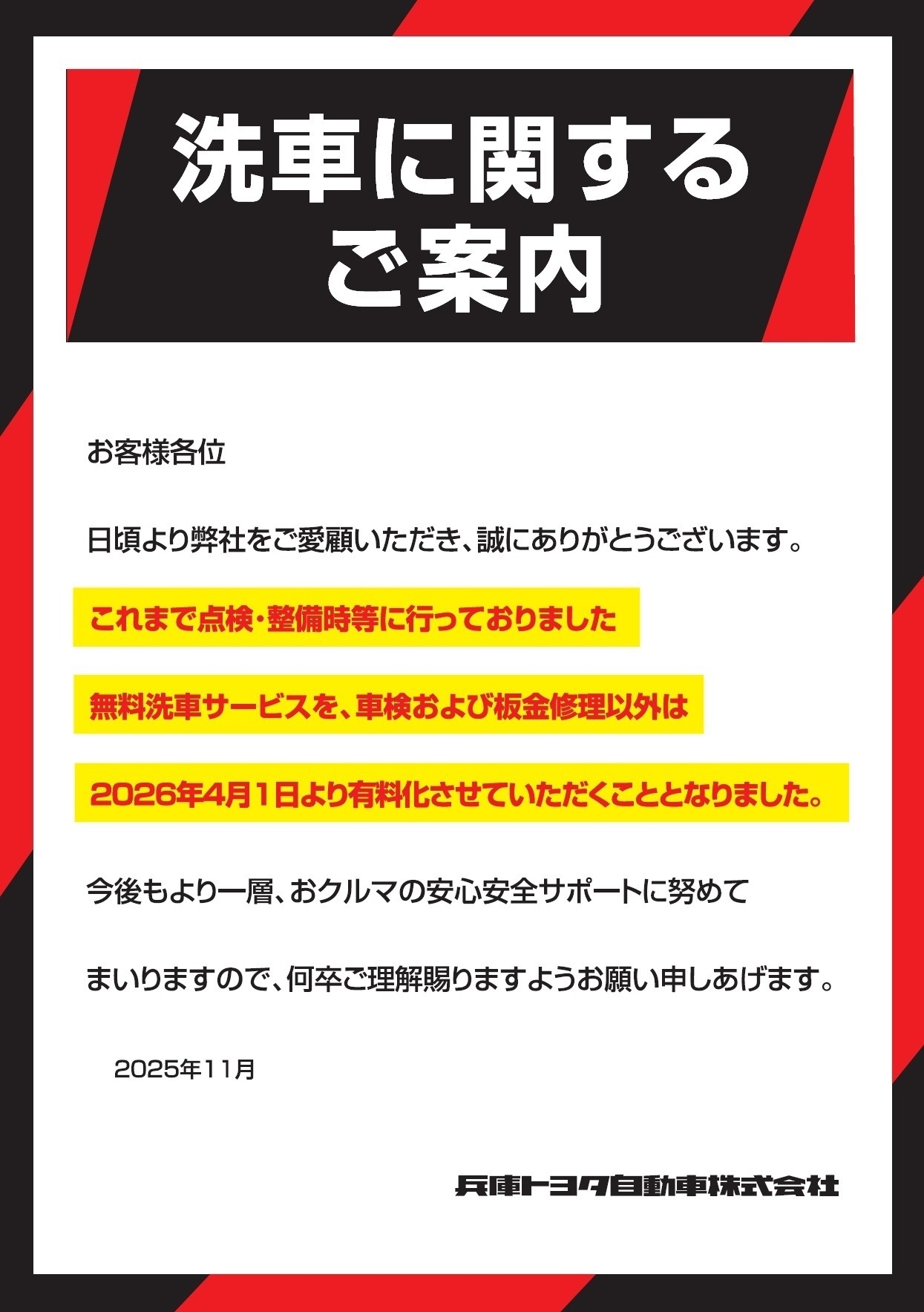 車検及び板金以外は4月1日より有料化とさせていただきます。