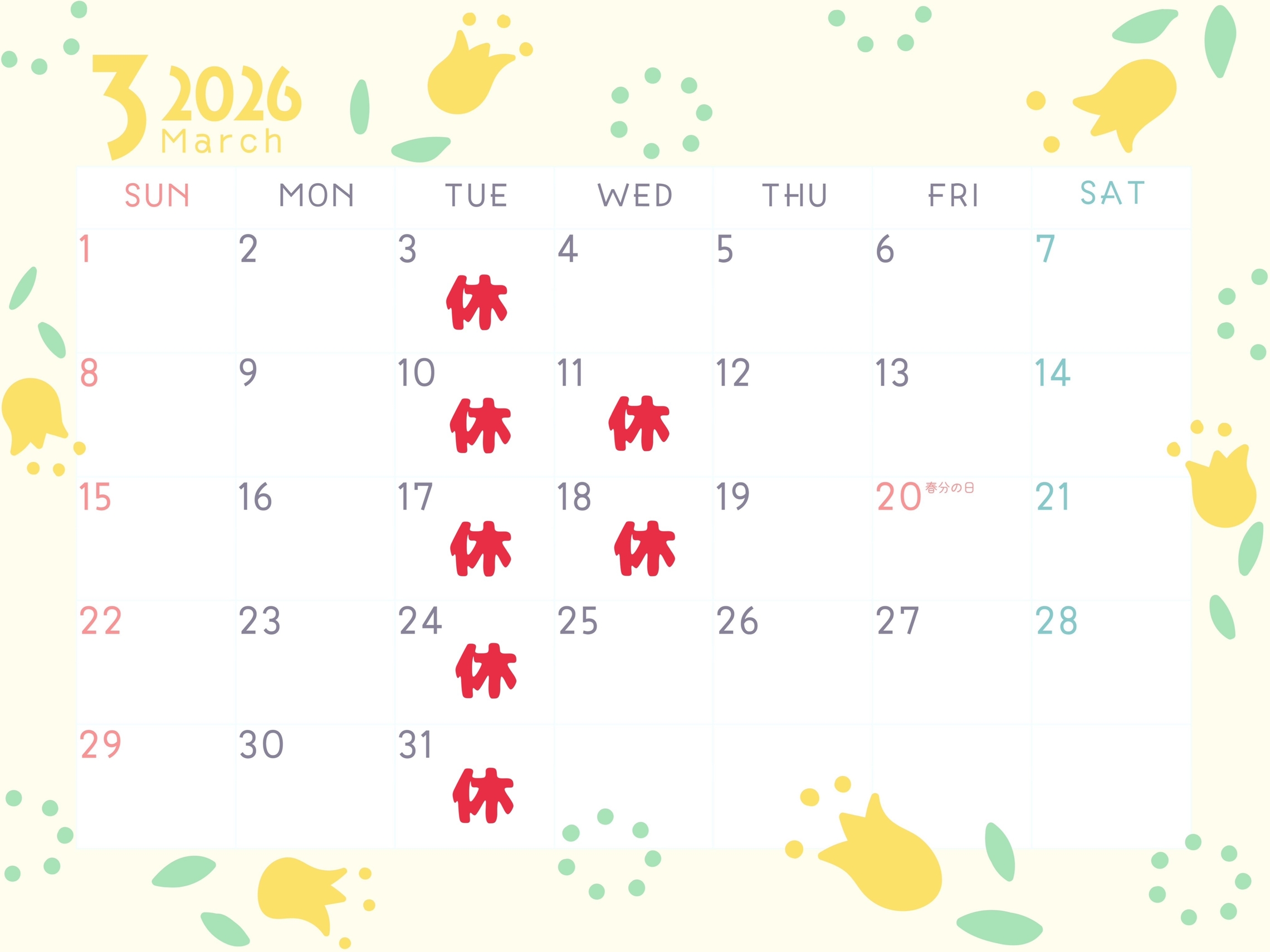 3月の定休日ご案内🌷