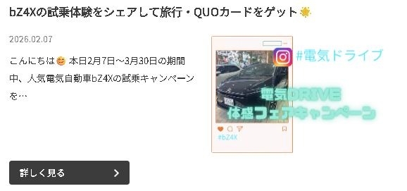 ⚡🔌bZ4X Touring発表🔌✨ 2026.02.25 こんにちは😊 本日、bZ4X Touringが発表されました✨ 話題の電気自動車bZ4Xの新シリーズ🔌✨ ツーリングならではの特徴やbZ4Xとの違いを是非聞きに来てください!! 皆さまのご来店をお待ちしております😊 そして現在、電気DRIVE体感フェアも実施中です! インスタグラムに試乗の感想を投稿するだけで、抽選でプレゼントが当たります🎁 当店には試乗車もございますので是非ご参加ください! 詳しくはこちら👇 電気自動車をお家で充電できる、充電器のサンプルも当店ショールームに展示中です🔌 詳しくはこちら👇 前の記事へ 店舗ブログ一覧に戻る 次の記事へ