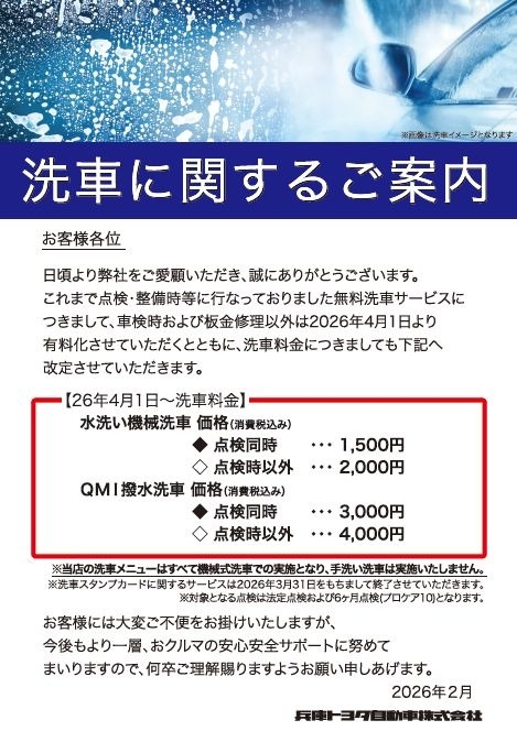 これまで点検・整備等に行っておりました無料洗車サービスが