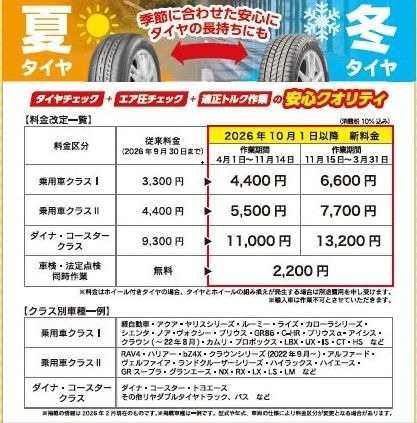 タイヤ履き替え作業料金を改定するとともに、