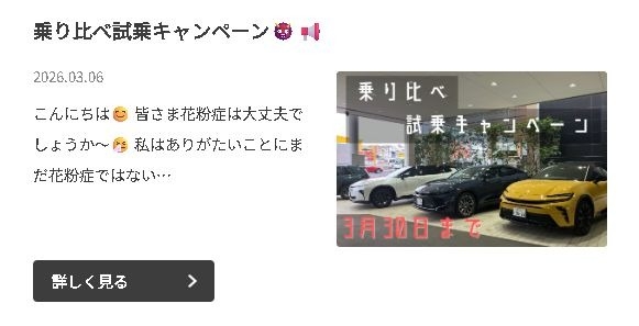 🌟3月末までのキャンペーン🌟 2026.03.25 こんにちは😊 最近、本を読んでないなぁと思い、読書好きの知り合いにオススメを教えてもらい数年ぶりに本を買いました📚 昨日届いたので数日は読書デーです👓 おすすめの本あれば教えてください😊 さて!当社では現在いろいろなキャンペーンを行っております✨ 現在行っているキャンペーンをご紹介します📢 3/30までのキャンペーンになります!!! あと一週間ですが、まだまだ間に合いますのでこの機会にぜひ皆様ご来店ください✨ 👇現在キャンペーン中詳細ブログ👇(タップで飛べます!) 皆様のご来店をお待ちしております😊 前の記事へ 店舗ブログ一覧に戻る 次の記事へ