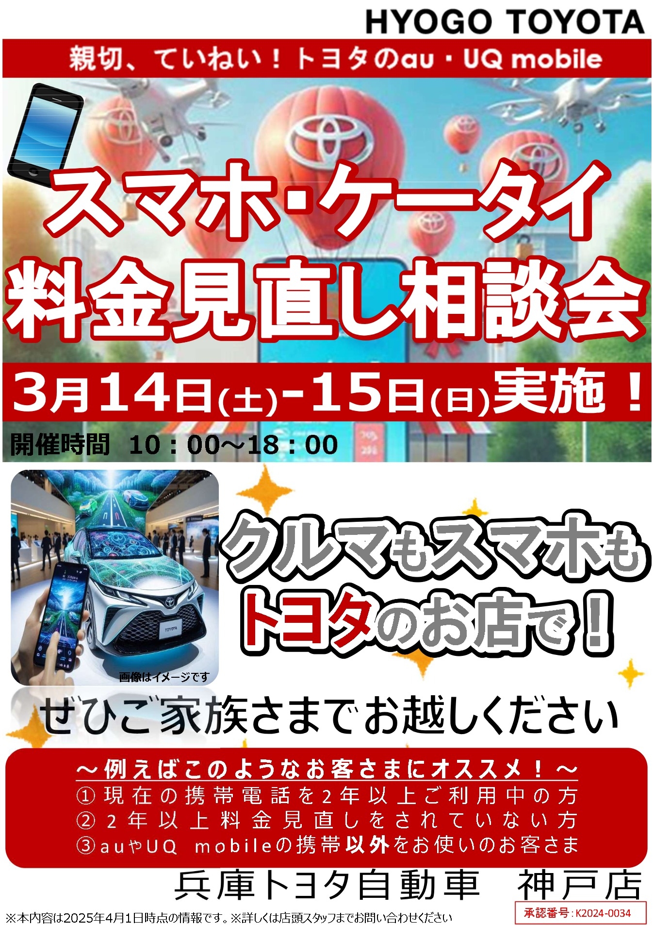 auイベント開催中です📲 2026.03.14 こんにちは いつも神戸店のブログをご覧いただきありがとうございます 本日より 3月14日(土)・3月15日(日)の2日間 auイベントを開催中です📱 月々の料金見直し等 KDDIのスタッフさんがご相談にお答えします🔍 ご予約お待ちしております📞 兵庫トヨタ自動車株式会社 神戸店☎ 078-576-5261 前の記事へ 店舗ブログ一覧に戻る 次の記事へ