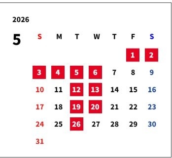 ゴールデンウイーク休業日と5月定休日のご案内