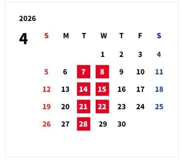 4月の定休日は毎週火曜日の7.14.21.28日と第2.3水曜日の8.15日