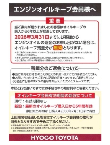 ご案内で「オイル会員様ご購入から6年以上経過しているお客様」へは下記画像のご案内をさせていただいております😊