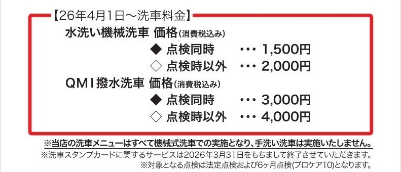 それに伴いまして、洗車料金を下記のとおり改定させていただきます。