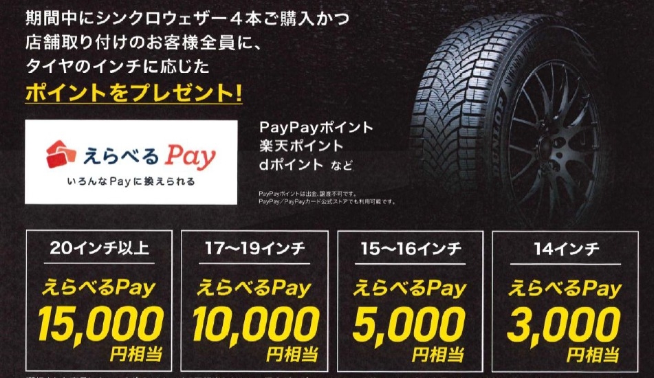 5月31日までの期間中にダンロップのシンクロウェザー4本をご購入したお客様に選べるポイントをプレゼント🎁💕