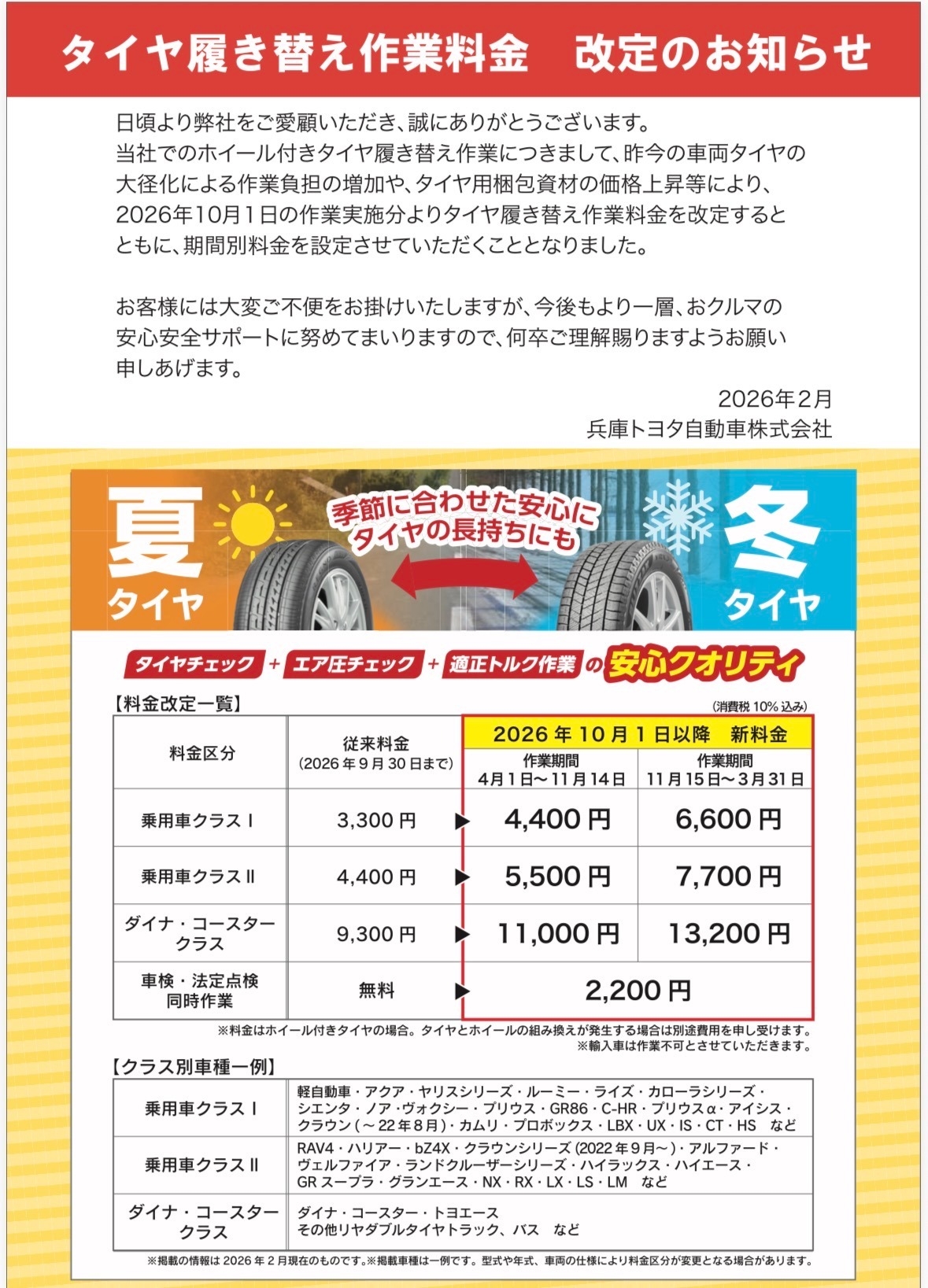 タイヤ履き替え料金改定のお知らせ🚗 2026.04.12 皆様こんにちは!三宮店です🌳 2026年10月より、タイヤの履き替え料金が改定となります🙇 ☟お車の大きさによってお値段が異なりますので、下記よりご覧ください☟ ⚠ホイールとタイヤの組み換えの場合は別途費用がかかりますのでご注意下さい⚠ タイヤ交換にはご予約が必要となります! スタッドレスタイヤからノーマルタイヤへの履き替えご予約が 混み合う時期ですので、お早めにお問い合わせ下さいませ🚙 本日も三宮店のブログをご覧いただきありがとうございました! 前の記事へ 店舗ブログ一覧に戻る 次の記事へ