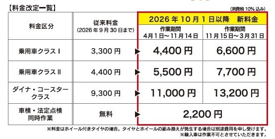 タイヤ履き替え料金価格改定のご案内🚗 2026.04.09 みなさまこんにちは! 兵庫トヨタ鈴蘭台店です😊 いつもブログをご覧頂きありがとうございます💖 本日は皆様へ大切なお知らせです✉ 2026年10月1日作業実施分よりタイヤ履き替え料金の価格改定をするとともに、期間別料金を設定させて頂くこととなりました。 ※車種によって料金が異なります 2026年9月30日までは従来料金となります。 みなさまには大変ご不便をおかけしますが 何卒ご理解の方よろしくお願い致します。 本日も最後までブログをご覧頂きありがとうございました🥰🥰🥰 前の記事へ 店舗ブログ一覧に戻る 次の記事へ
