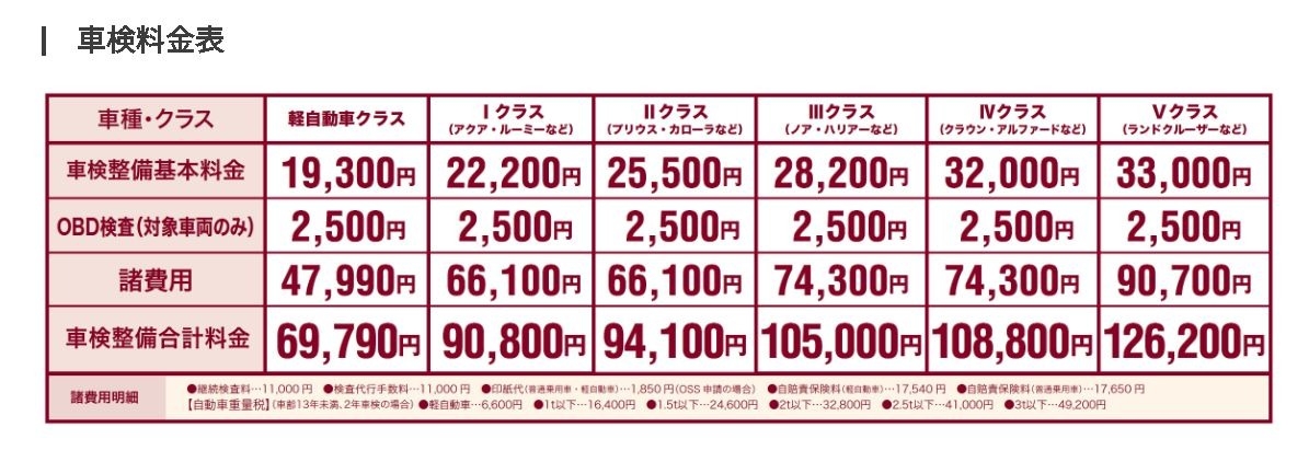 車検の料金に関しては下の料金表を参考にしてください😊