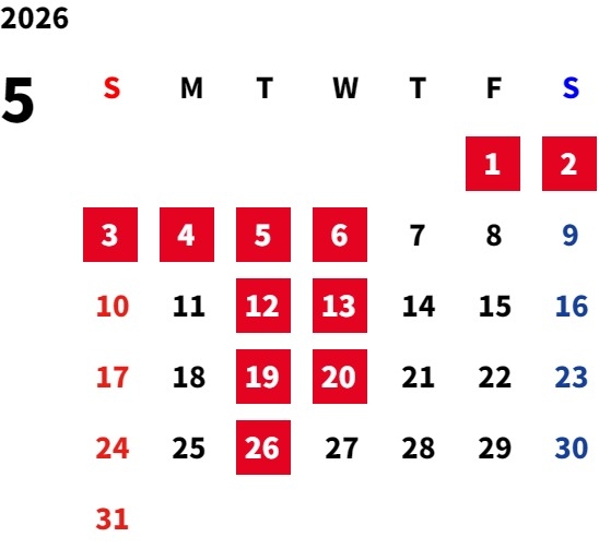 5月の定休日をご案内いたします。