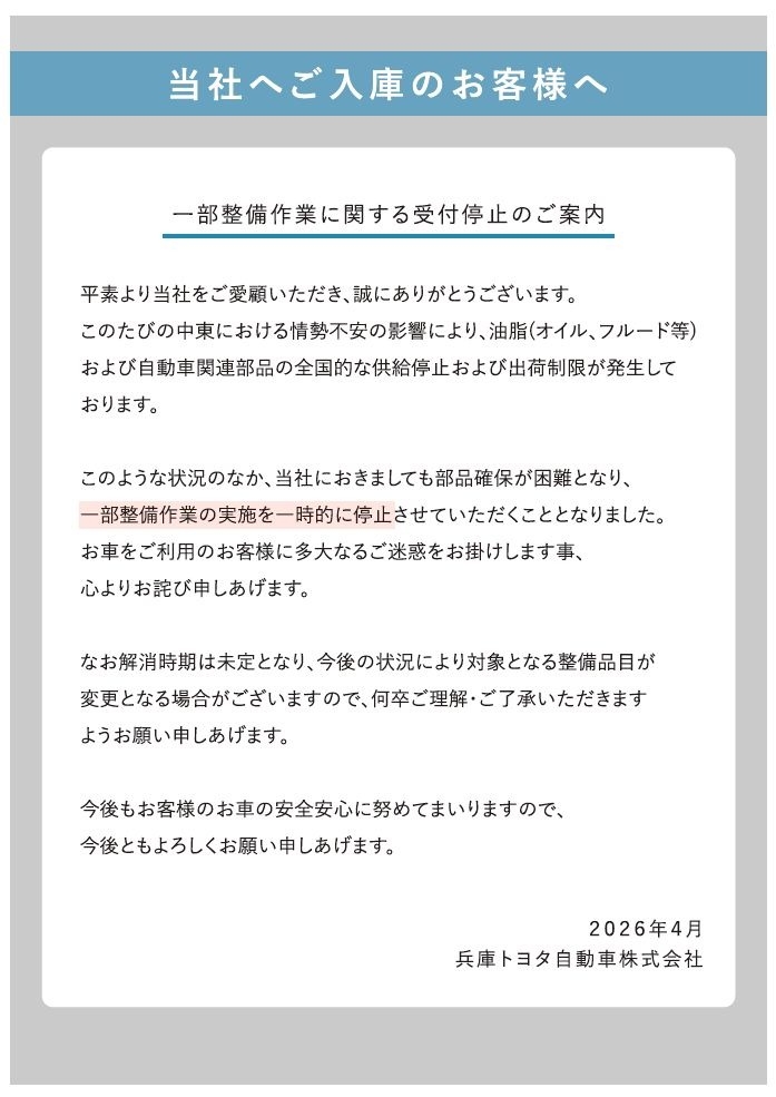 当社へご入庫のお客様へ 2026.04.29 こんにちは 灘店です。 いつもご入庫いただいているお客様へお知らせです。 今後、状況に変更がございましたら、当ブログにて改めて ご案内させていただきます。 ご迷惑をおかけいたしますが、何卒ご理解・ご了承いただきますようお願い申し上げます。 灘店☎078-861-5471 前の記事へ 店舗ブログ一覧に戻る 次の記事へ